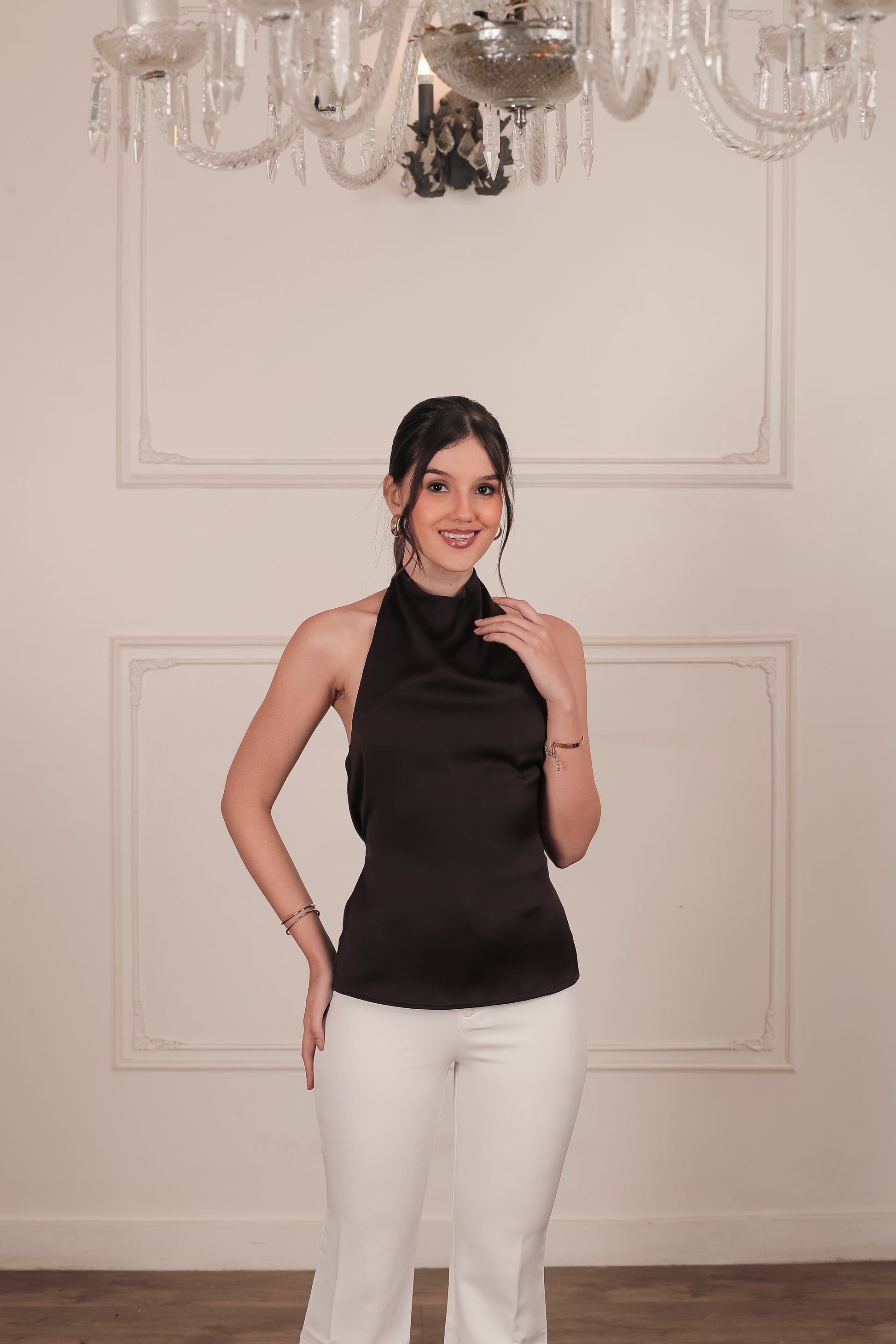 Halter-style satin top with a soft draped neckline, a clean strap-back design, and a waist tie for a smooth, sculpted fit.