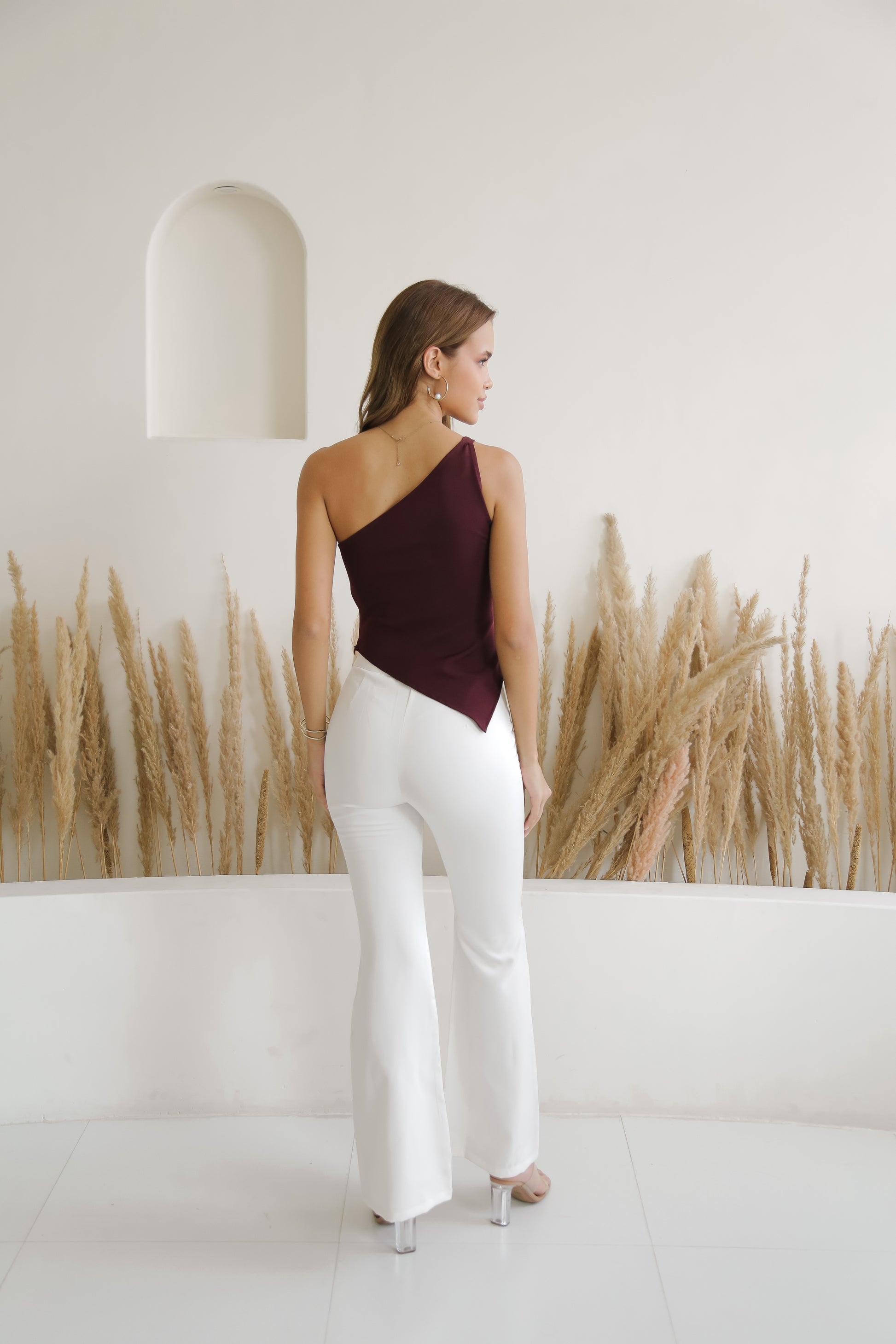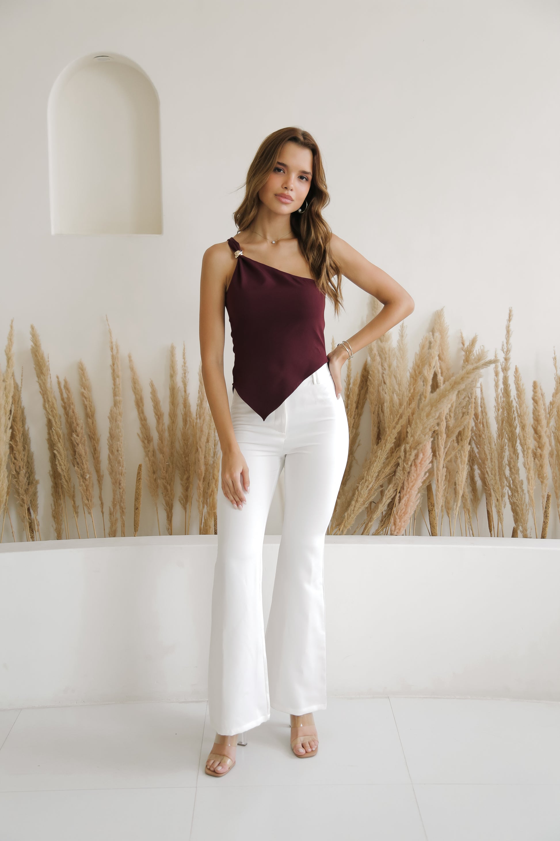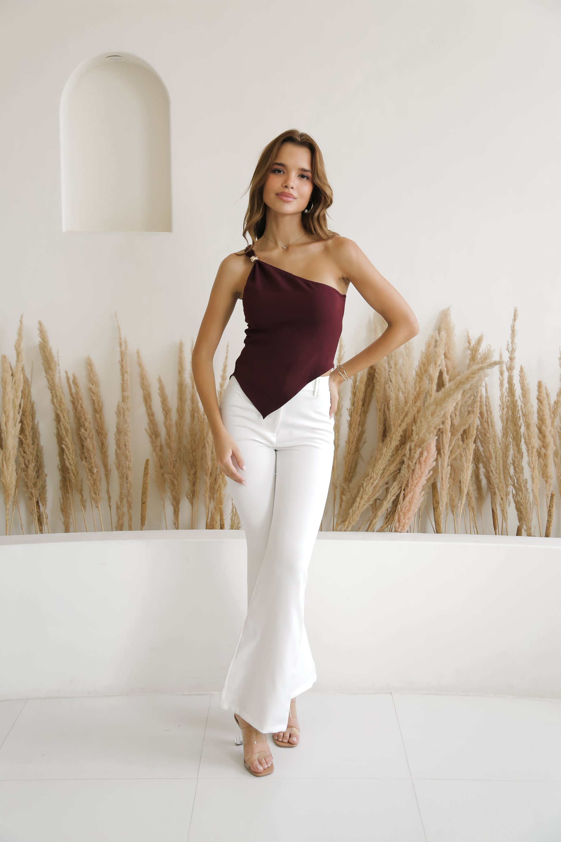 Sleek one-shoulder burgundy top with an asymmetric hem and gold buckle at the strap. Perfect for a night out.