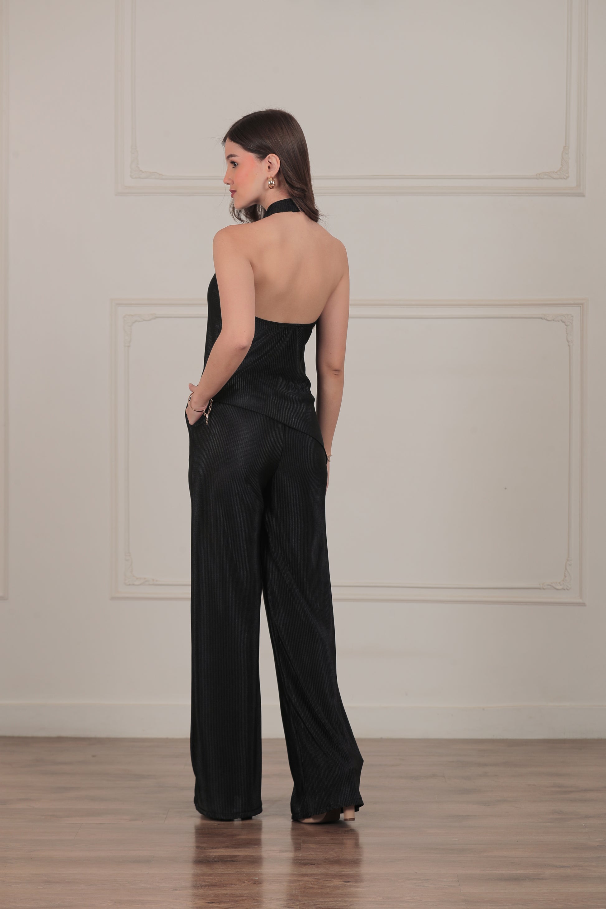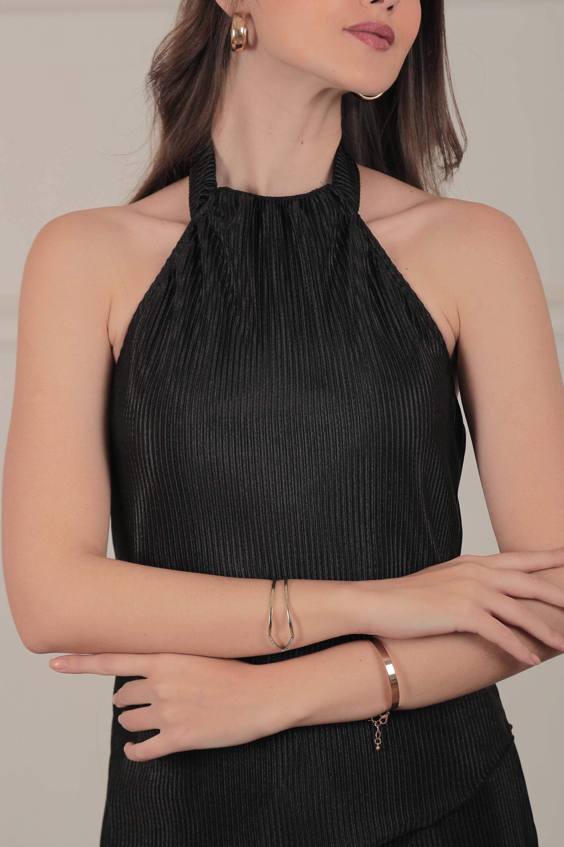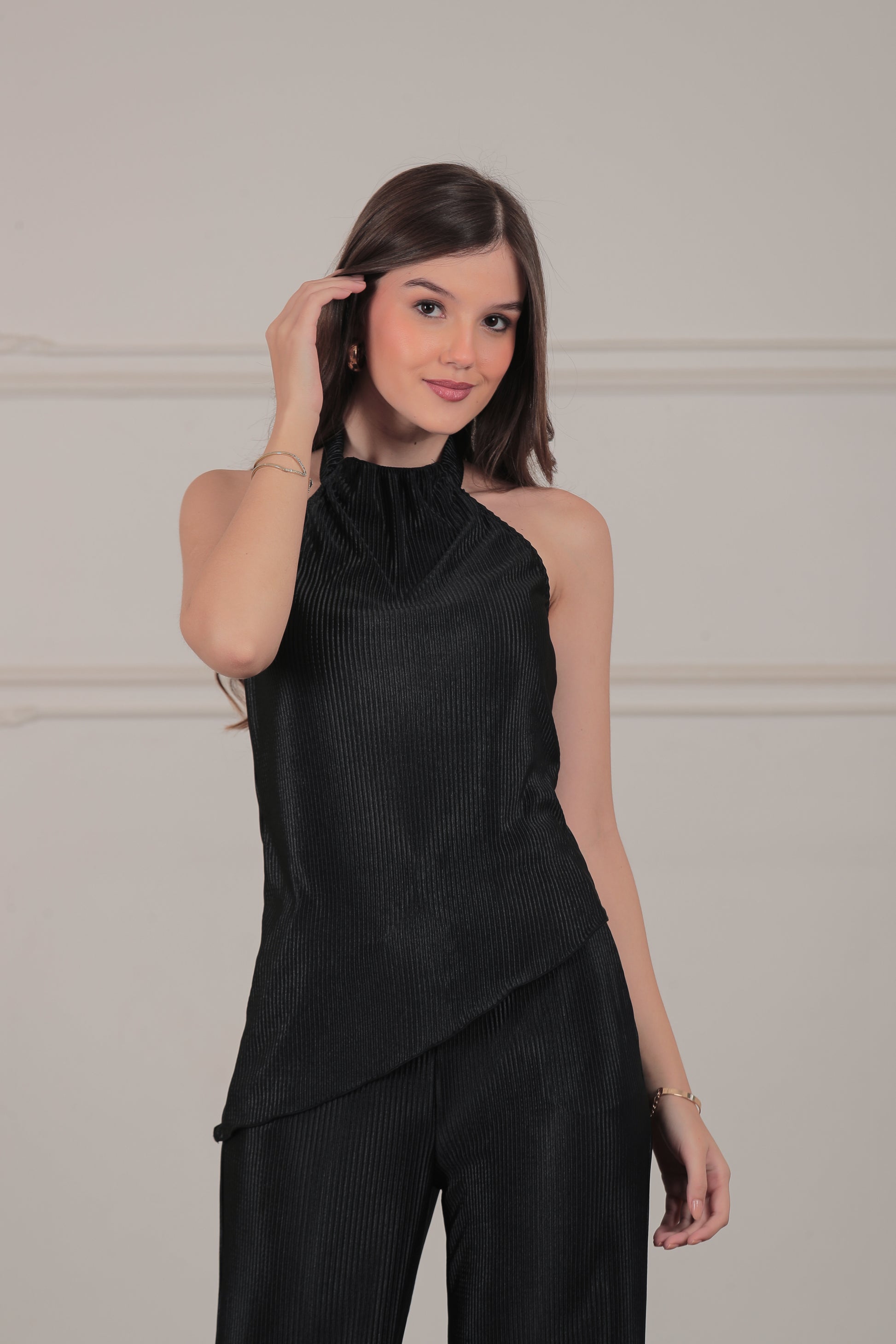 TOP - Longline top featuring a neck band that transitions into a halter neckline, finished with an asymmetric layered hem for a soft, flowing look.